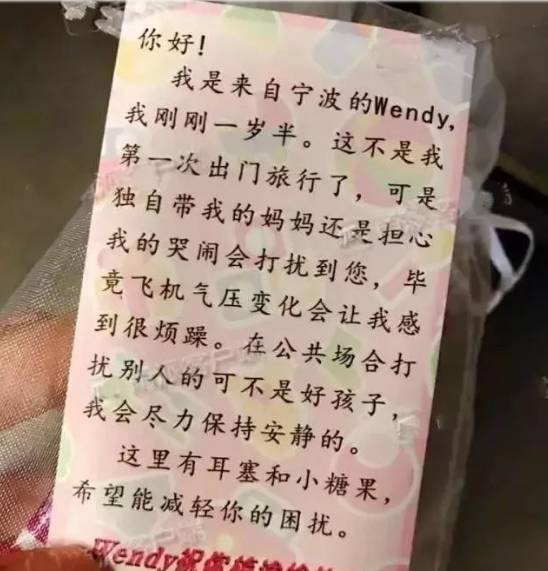 “我是来自宁波的Wendy,我刚刚一岁半…独自带我的妈妈担心我的哭闹会打扰到您,这里有耳塞和小糖果,希望能减轻你的困扰……”